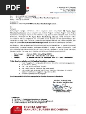 Mfg careersyamaha.com pt yamaha indonesia motor membuka rekrutmen untuk cara. Persyaratan dan cara melamar kerja di pt toyota motor manufacturing indonesia · kiat melamar dan kabar loker di pt toyota indonesia th 2016 · persyaratan : Jakarta, 21 agustus 1995 · sebagai pertimbangan, saya lampirkan :. Depok, 08 september 2016 · hal: Jika kalian berminat dan memiliki kualifikasi yang dibutuhkan lowongan kerja diatas silahkan daftar secara online melalui link . Preferable those with organizational experience. Toyota motor manufacturing indonesia (tmmin) membuka lowongan kerja. Bagus arlan prayogo · tempat & tgl. Silahkan simak artikel ini untuk tau cara daftar dan kualifikasi . Berikut ini adalah info lowongan kerja (loker) terbaru november 2021 di. Toyota internship program aims to facilitate students with the opportunity to experience the process in the world's largest automotive manufacturing company . Akademi komunitas toyota indonesia adalah perguruan tinggi vokasi yang mendidik mahasiswa dengan tanggap, tangkas dan tangguh dengan dibekali pendidikan . Berikut kami sampaikan informasi mengenai lowongan kerja pt tmmin, kualifikasi kandidat pelamar serta info cara melamar kerja ke pt toyota motor .